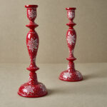 Handmade from local wood, these 12″ hand-painted wooden candle stick holders are hand-painted in traditional Kashmir designs.